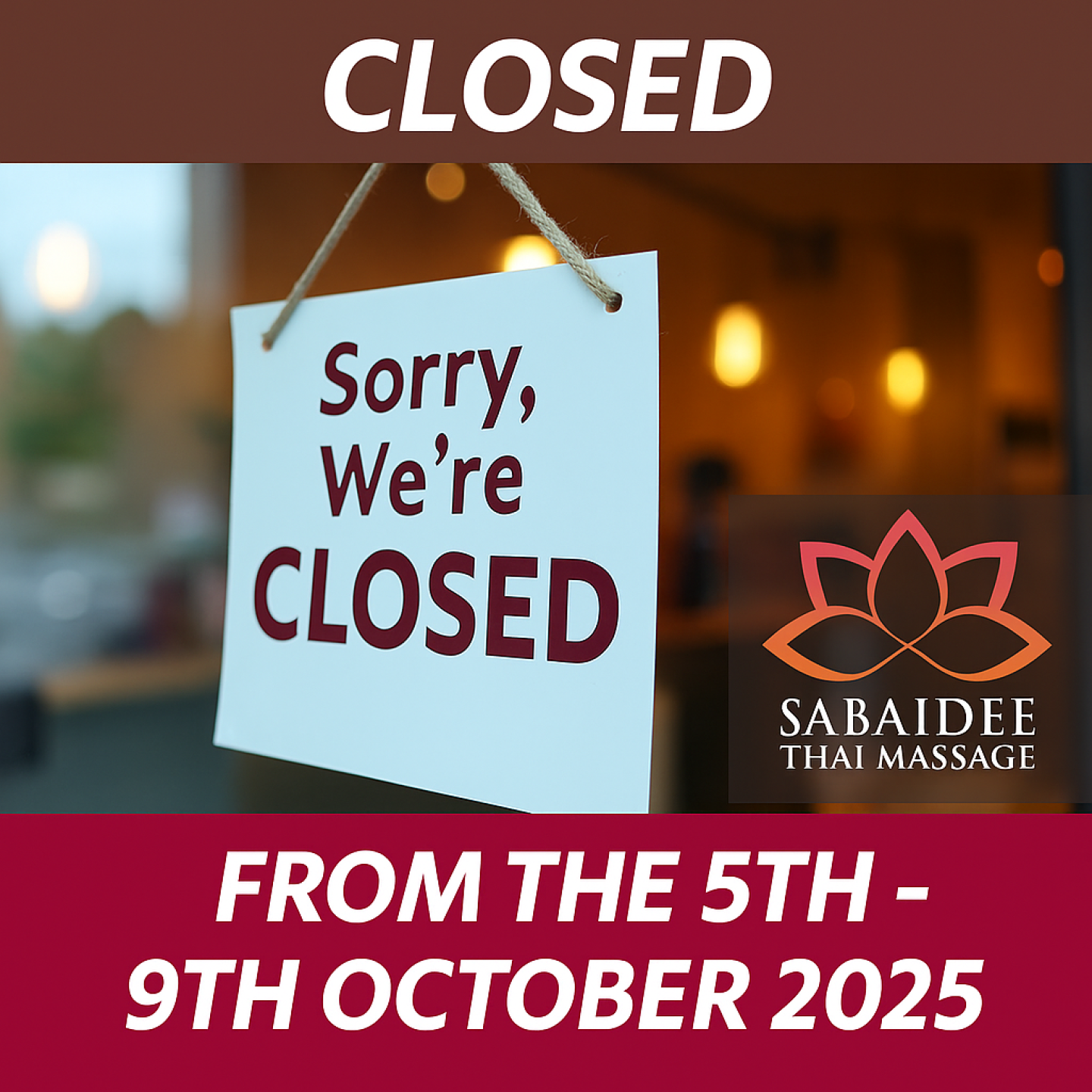 Sabaidee Thai Massage will be closed from Sunday 5th – Thursday 9th October 2025 as our Pain Angels take a well-deserved rest. We’ll reopen on Friday 10th October 2025, ready to welcome you back for relaxation, renewal, and relief. In the meantime, you can still plan ahead and secure your spot.